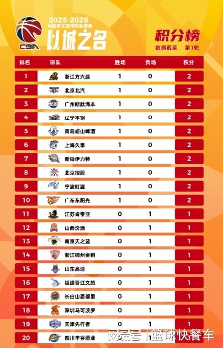 CBA常规赛第1轮比赛全部战罢,随后最后三场比赛结束,广东队、宁波队以及上海队分别击败对手,拿到赛季开门红。而在广东、宁波以及上海三支球队拿到首胜后,CBA积分榜也发生了微妙