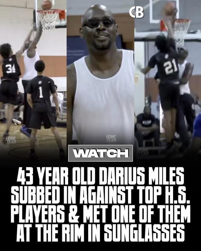 直播吧9月21日讯 43岁的前NBA球员达柳斯-迈尔斯现身美国高中,他戴着墨镜就参与到比赛之中。