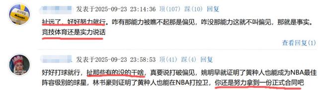虽然曾凡博想要表达自己留在NBA的雄心壮志,但因为他的实力多少还是遭到球迷的质疑(毕竟在CBA都没能打出统治级的数据),有球迷也直言:“扯远了,好好努力就行。有那能力被瞧不起是偏见,没那能力这就不叫偏见,那就是事实,竞技体育还是用实力说话”、“真要说打破偏见,姚明早就证明黄种人也能成为NBA最佳阵容的球星,林书豪则证明黄种人也能在NBA打控卫,你还是努力拿到一份正式合同吧。”