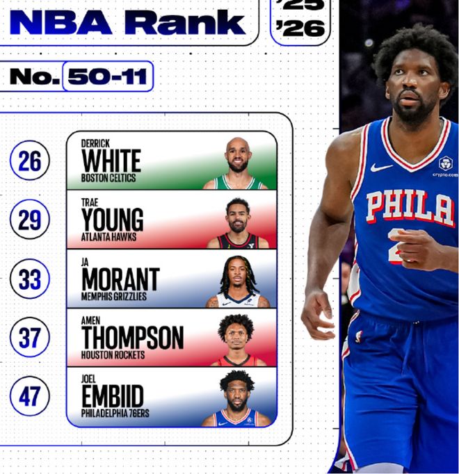 著名美国媒体ESPN一如既往在本赛季前为排了一个NBA现役前100名球员榜单,恩比德2年前还是MVP获得者竟然已经跌到第47名,ESPN不少专家认为如果恩比德能健康出赛50场,哪怕是上赛季的数据:以34.3%的使用率砍下场均23.8分8.2板4.5助攻的数据,他仍然是联盟前20名左右的球员。