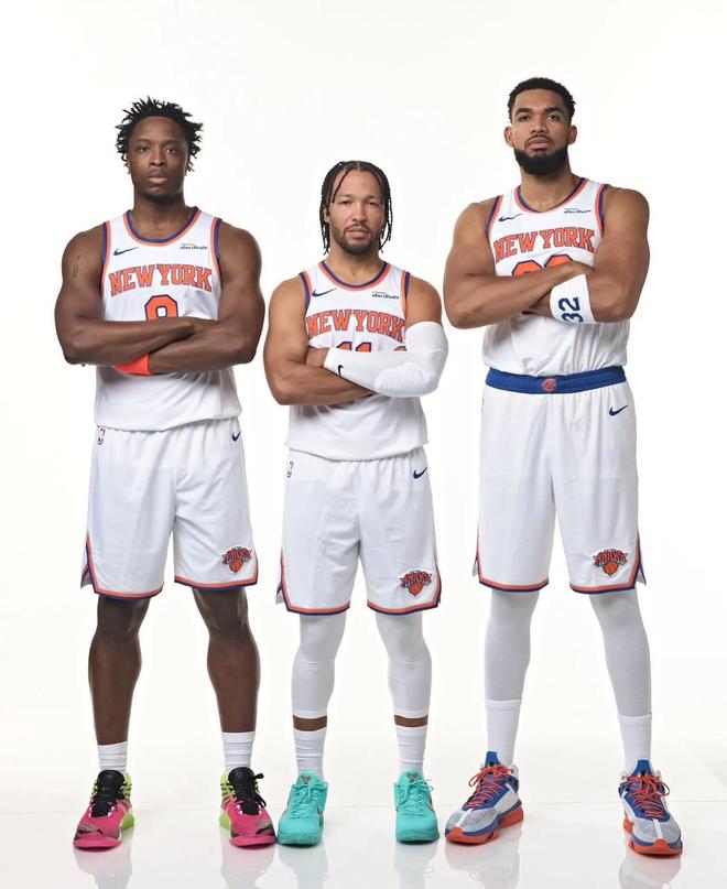 上图为NBA官方所更新的尼克斯定妆照,布伦森官方身高为188cm,唐斯则为213cm,OG为201cm。