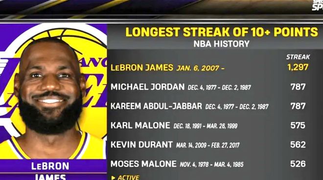 五、连续得分上双纪录1297场:历史第一的“稳定之王”