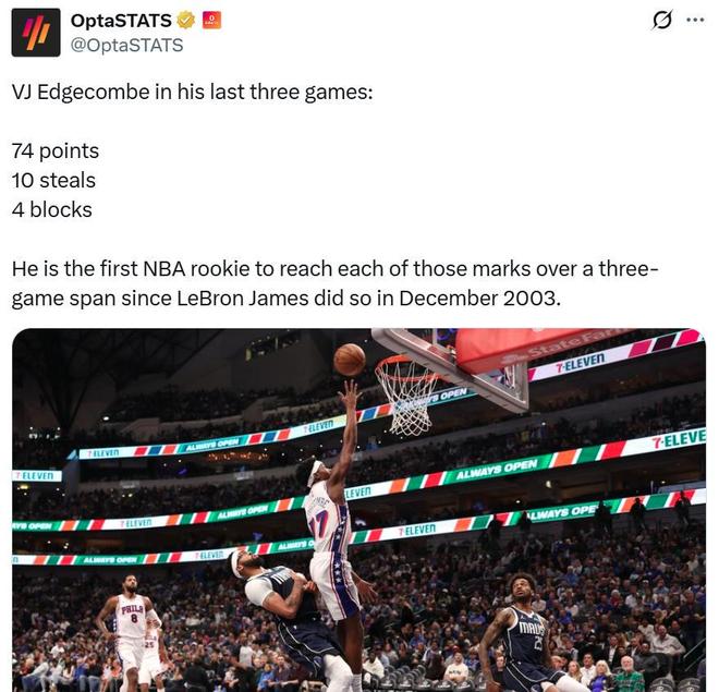 作为25年的新科探花郎,VJ埃奇库姆首秀打出历史级别表现后,一度因伤遭遇新秀墙,但在重返赛场后,VJ埃奇库姆重新证明自我,本场又交出傲人表现。