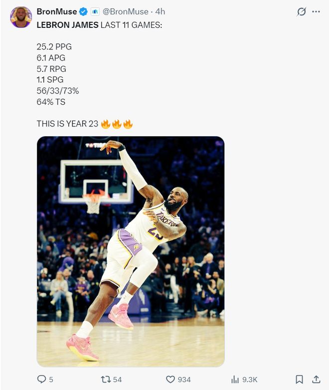 过去詹姆斯9场比赛,场均33.2分钟,拿到25.4分5.9助攻4.6篮板,命中率54.3%,美媒认为41岁的他还是有全明星水准。