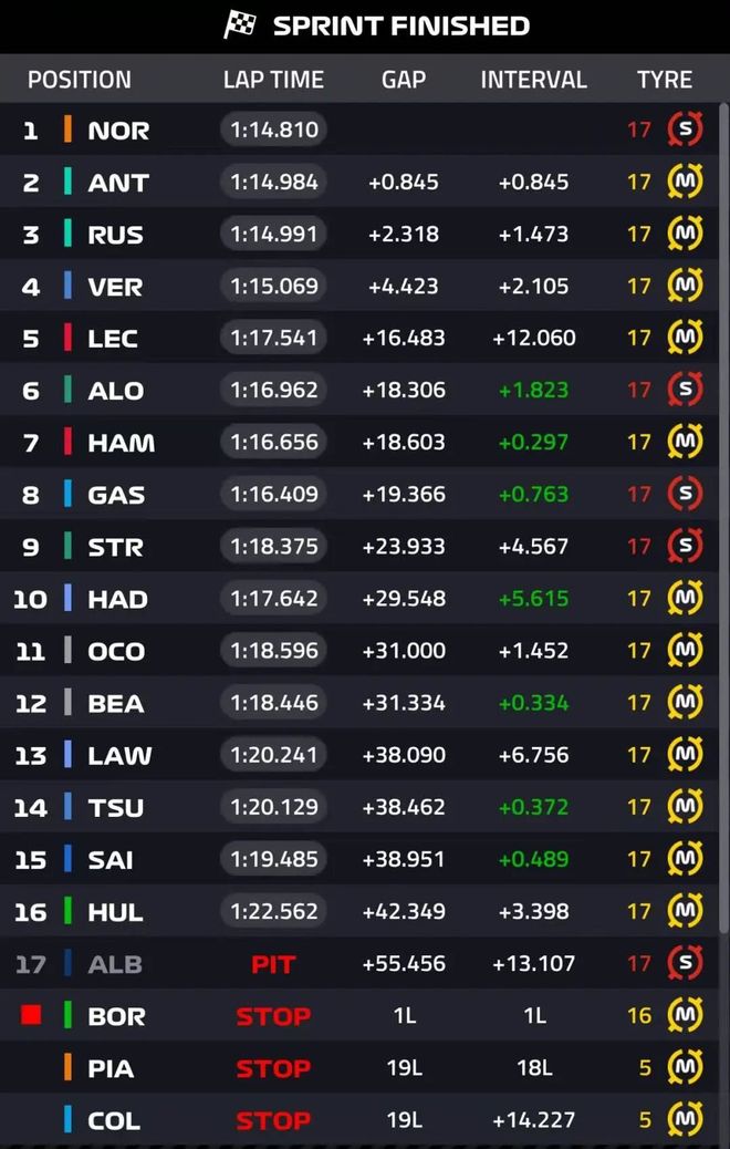 比赛随着滚动发车重新开始,前方车阵虽然靠的挺近,但是始终没有能够到DRS区,使用红胎的诺里斯逐渐被安东内利追近,第20圈时,安东内利进入诺里斯的DRS区,但是很难完成超越,勒克莱尔则是超越阿隆索来到第五的位置。博托莱托则是在最后一圈打滑上墙退赛。这车估计一时半会也修不好了……