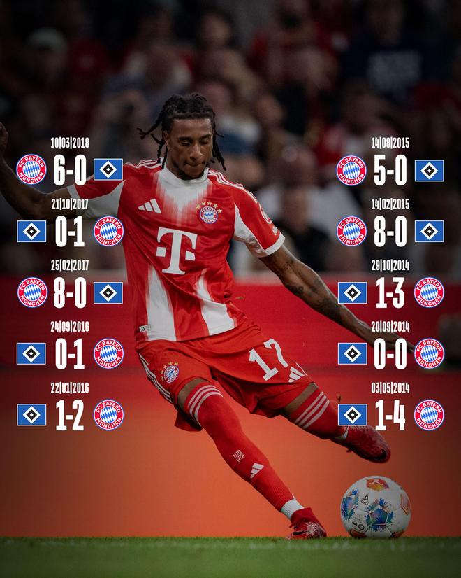 赛前拜仁官方的统计指出,历史上他们曾和汉堡在德甲联赛中一共交手过106次,总成绩为65胜22平19负,近17次在德甲联赛中交手,拜仁取得了14胜3平,打进63球仅丢6球的压倒性战绩,汉堡上一次在德甲联赛中击败拜仁还要追溯到2009年9月。