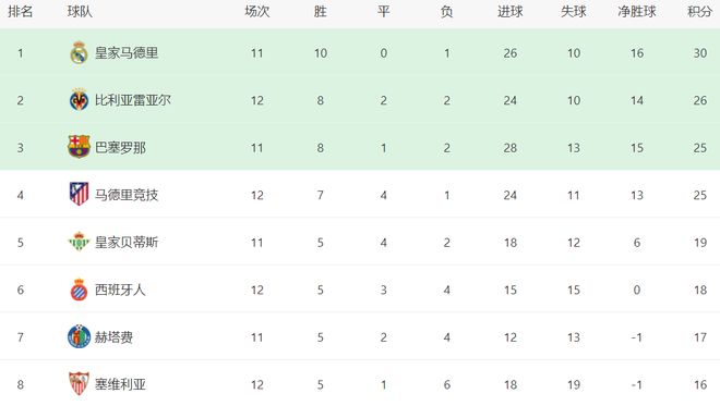 在积分榜上,皇马以30分领跑,10胜1负的战绩极其出色。比利亚雷亚尔这匹大黑马超越了巴萨,升到了第2名。比利亚雷亚尔的战绩是8胜2平2负,拿到26分。而巴萨只拿到25分,排名第3。不过,巴萨比比利亚雷亚尔少踢1场。马竞赢球之后,总积分也达到25分,只是因为净胜球不如巴萨,只能排名第4。皇家贝蒂斯以19分排名第5。第6的是赫塔费,拿到了17分。