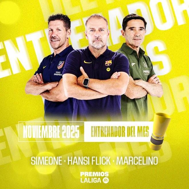 官方消息,西甲11月最佳主教练候选名单公布,分别是弗里克、西蒙尼和马塞利诺。