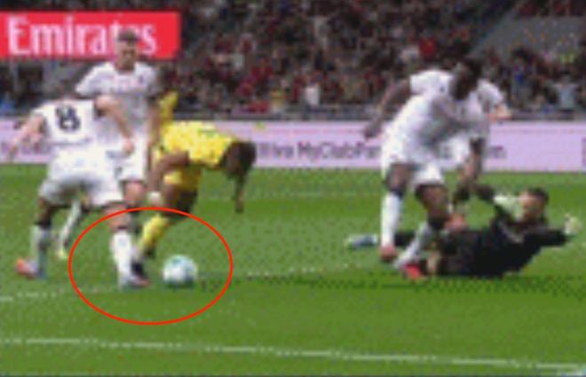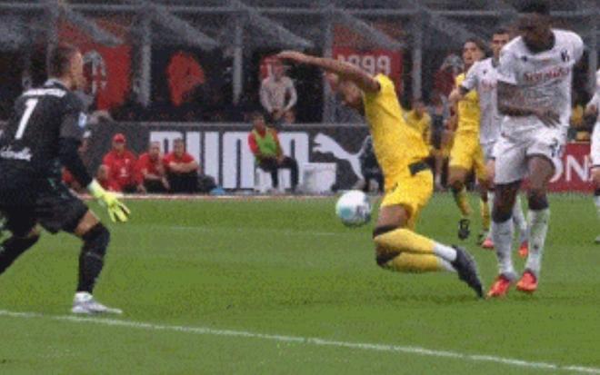 比赛继续,恩昆库迅速爬起来,控制住皮球,试图继续射门。此时,另一位博洛尼亚后卫伸腿,将恩昆库踢倒在地。裁判随即吹响哨子,示意米兰获得了点球。他认为博洛尼亚第二次的防守动作是个犯规。