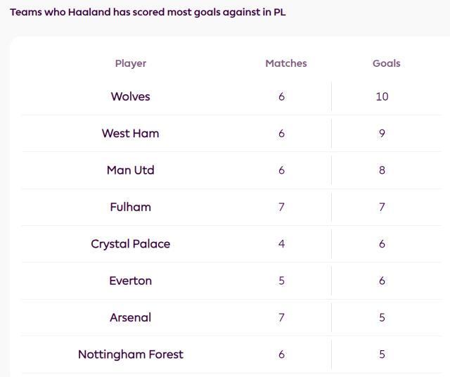 ②哈兰德对遇到过的全部英超球队都进过球,累计23支球队。狼队是他的最爱,6次碰面戳了10个窟窿。豪门中,曼联对魔童最慷慨,6次交手被他打进8个。