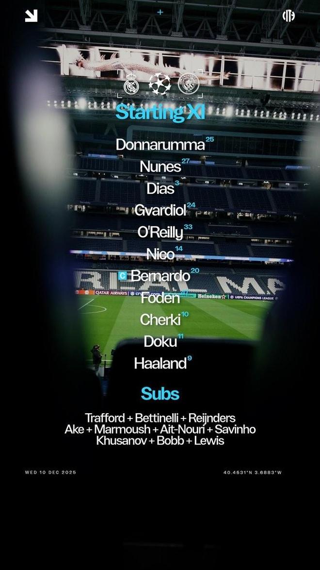 北京时间12月11日04:00,欧冠 联赛阶段 第6轮,皇家马德里主场迎战曼城,赛前双方球队首发名单公布如下:【上咪咕独家看英超】