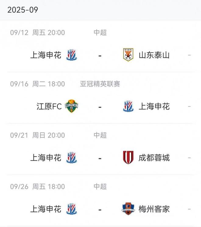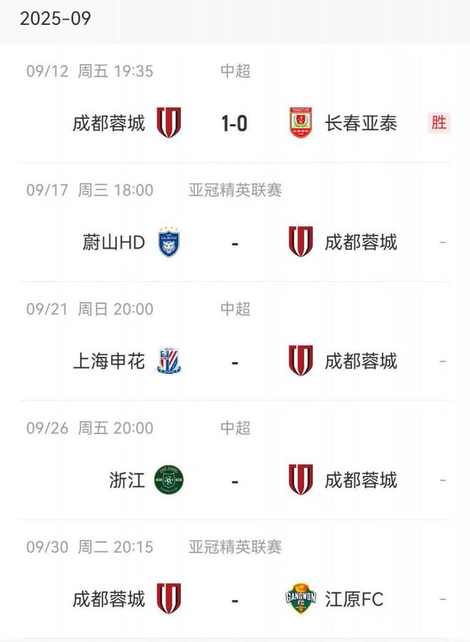 赛程方面,这场中超争冠关键战前双方还各自需要前往韩国客场踢一场亚冠精英联赛,申花将客战江原FC,蓉城则将客战蔚山HD。