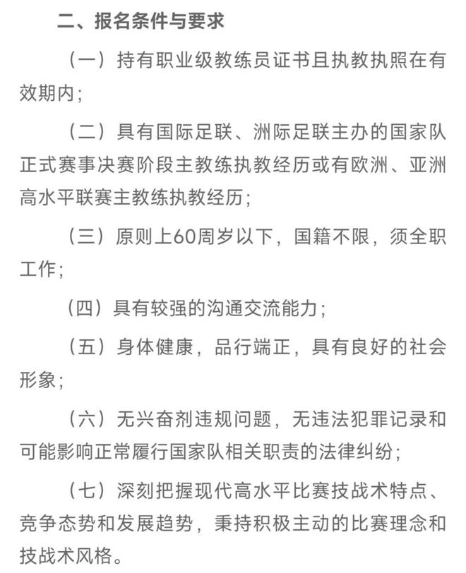 第三,原则上60周岁以下,国籍不限,须全职工作;第四,具有较强的沟通交流能力;第五,身体健康,品行端正,具有良好的社会形象;第六,无兴奋剂违规问题,无违法犯罪记录和可能影响正常履行国家队相关职责的法律纠纷;